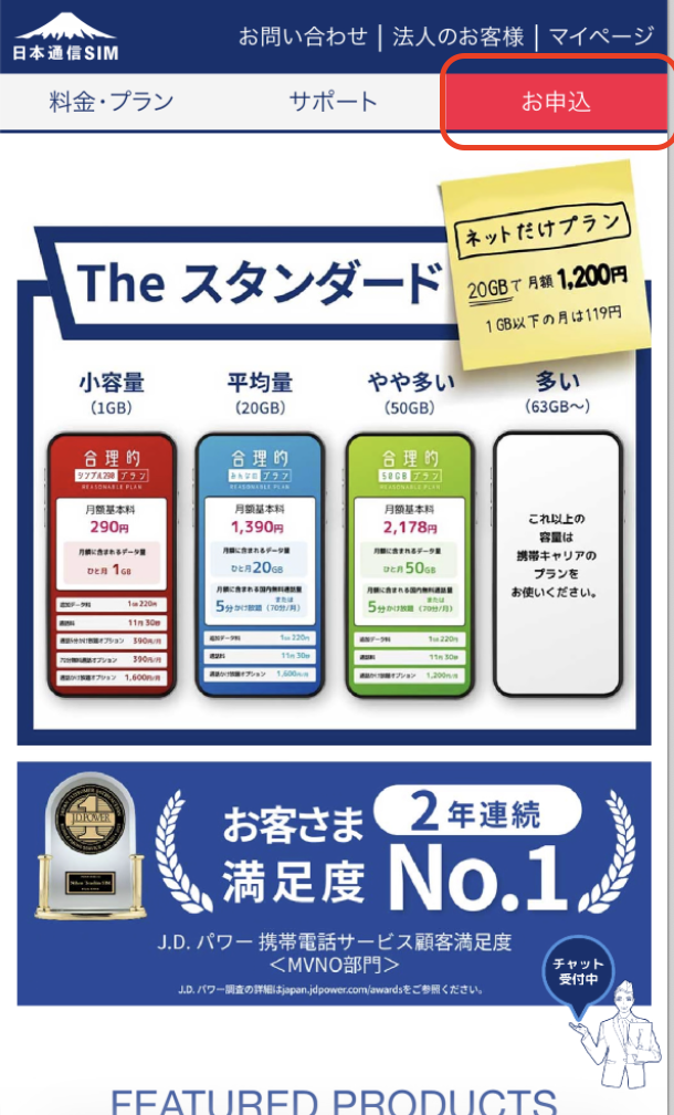 日本通信SIM HP へアクセス