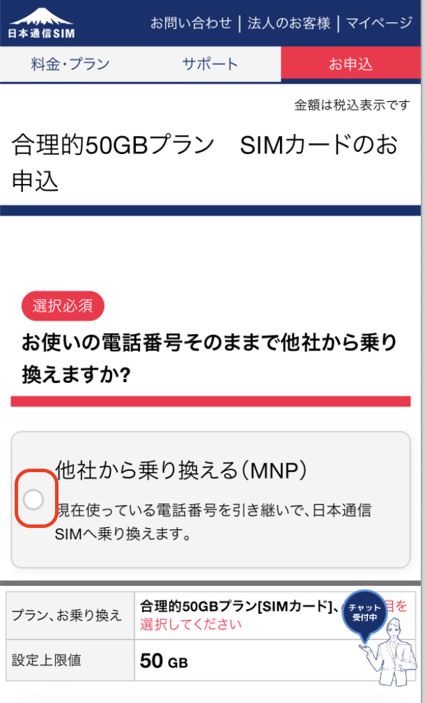 他社から乗り換える場合は(MNP)を選択