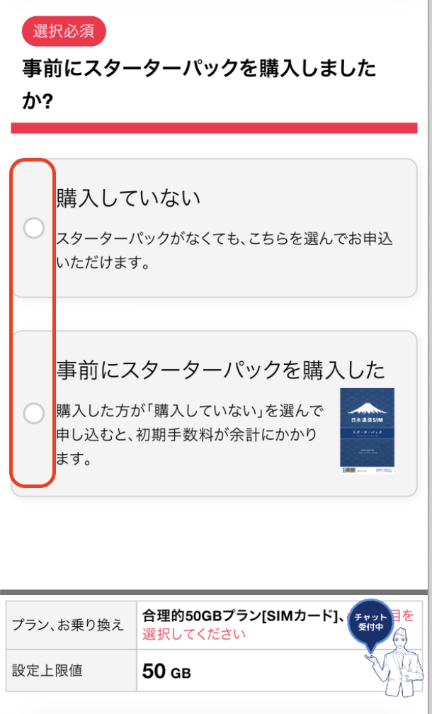 スターターパックの購入有無を選択