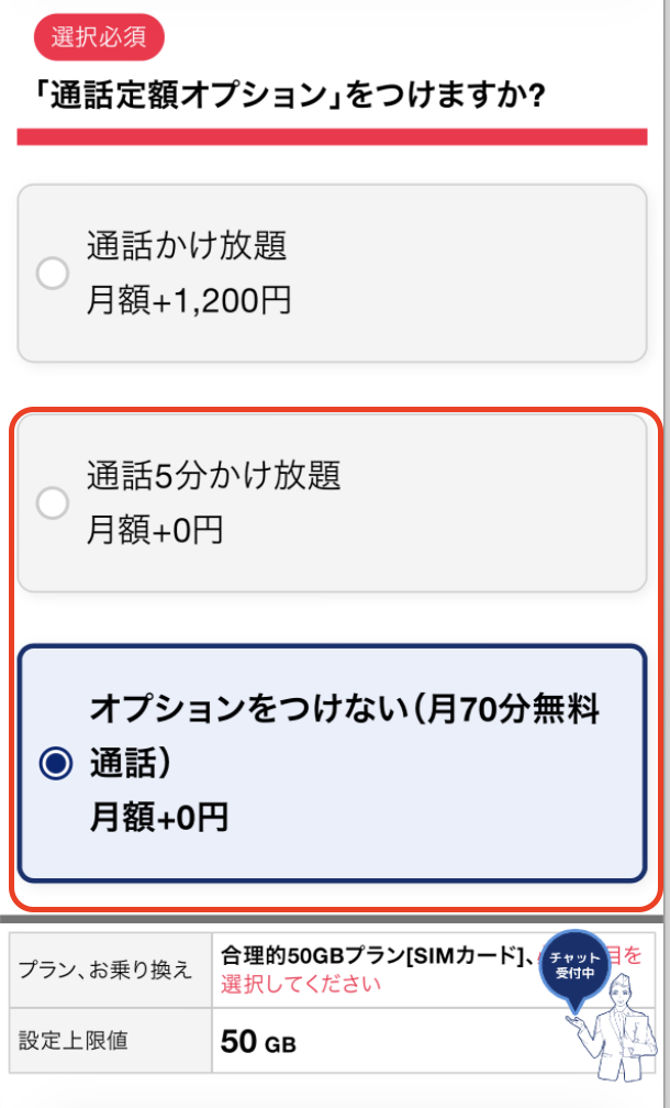 通話オプション(通話5分間かけ放題 又は 月70分無料通話)