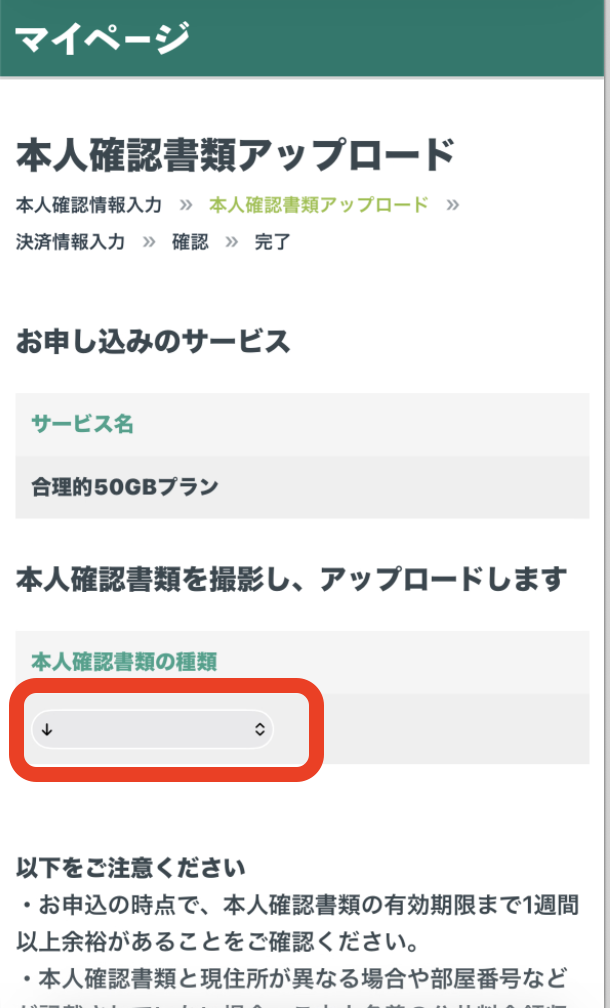 契約者確認画面(本人確認) 選択の物をアップロード