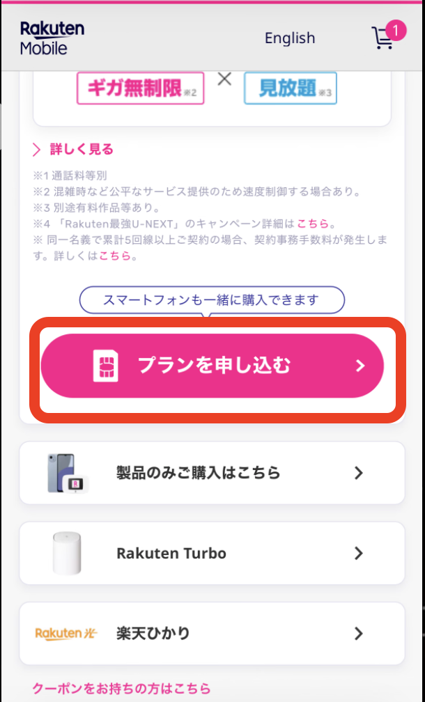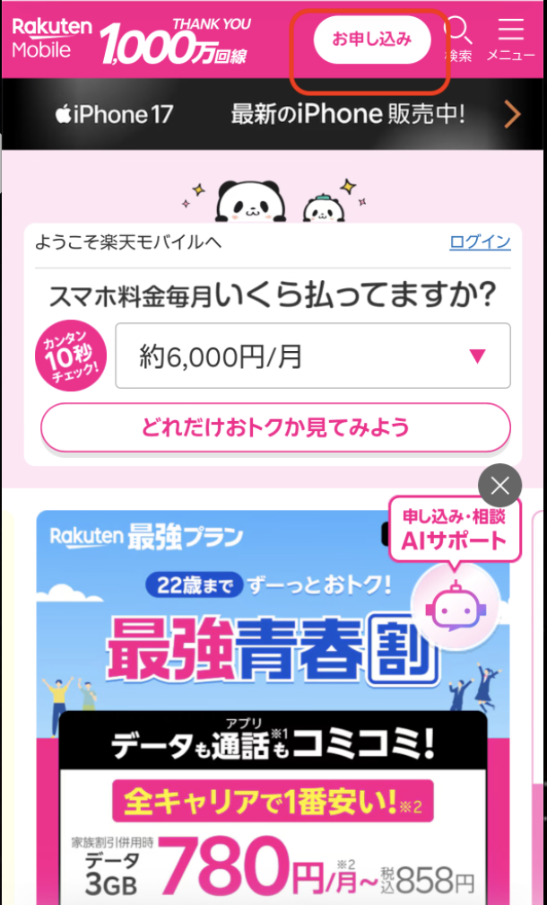 楽天モバイル HP へアクセス
