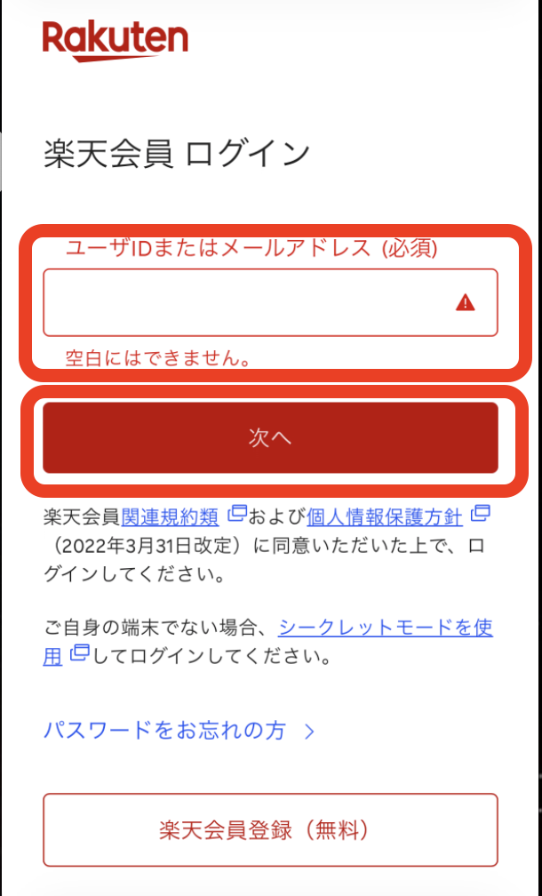 楽天ログイン画面