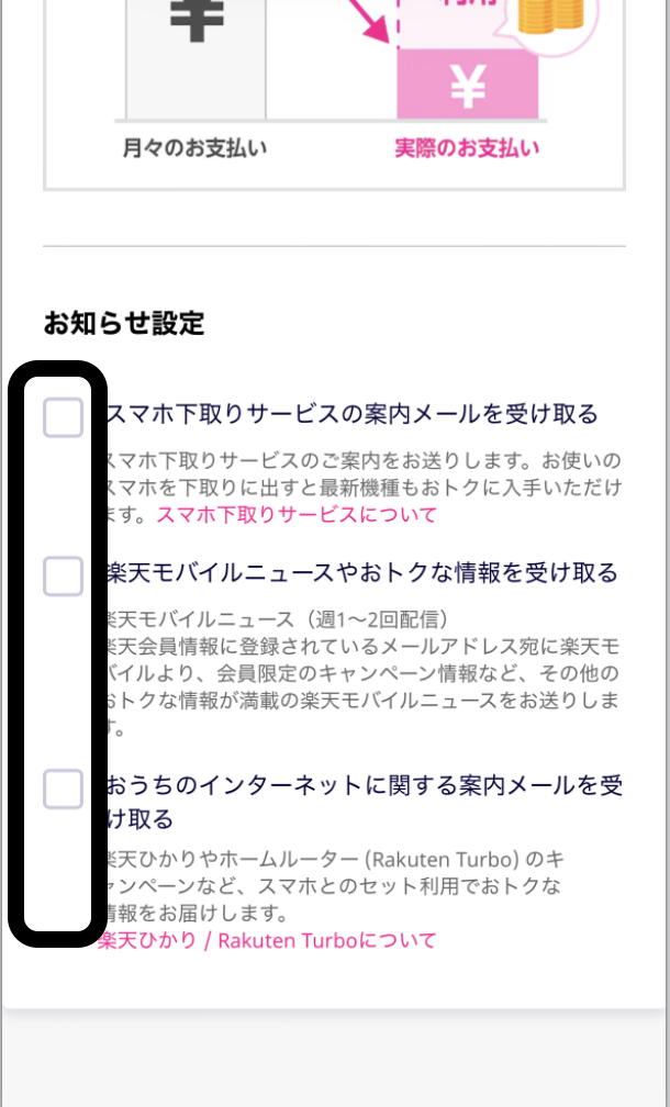 右の画像(申し込みの下部へ行くとお知らせ設定があるのでオフにします)