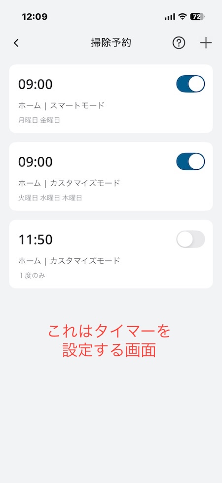 スマホのタイマーのように掃除開始の曜日と時間を細かく設定できます。