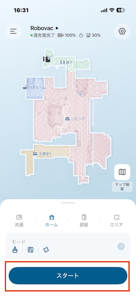 部屋限定でも掃除出来るので、例えば(リビング・キッチン・寝室・バスルーム)のリビングだけを選択して掃除を指示する事もできます。